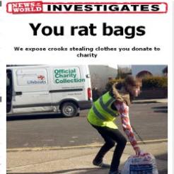 The News of the World published the investigation entitled "You rat bags" in its paper and on its website yesterday, exposing a "string" of legitimate collectors reportedly licensed by Kidney Research UK and the RNLI picking up collections left for other charities. The story said that Help the Aged, the NSPCC and the British Heart Foundation were all affected by the "scam".