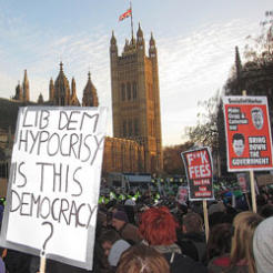 The report also highlights the recent rise in direct action, citing the protests againt the war in Iraq in 2003, the Drax climate camp in 2006, and more recently the tuition fees marches and sit-ins at corporate premises by UKUncut demonstrators. Southampton University lecturer Dr Clare Saunders states that a "rising trend towards use of direct action looks set to continue".