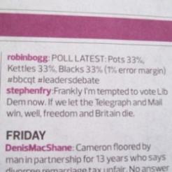 Made during a BBC Question Time discussion of the party leaders’ attitudes to immigration, Bogg's tweet reads: “POLL LATEST: Pots 33%, Kettles 33%, Blacks 33% (1% error margin)”.