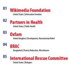 Oxfam, Save the Children and Amnesty International are ranked 3rd, 18th and 19th respectively. The US magazine, a bi-monthly title that covers global governance, publishes the full top 100 list in its January/February 2012 issue, currently available online.