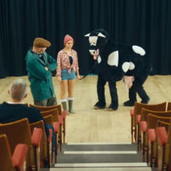 As part of a promotion for its Christmas gift catalogue, the charity has released an 80-second film that features a rural cattle farmer breeding a host of pantomime cows. The farmer feeds up his cows for panto season, and teaches them how to “milk applause” in his milking shed, and auctions them to theatre directors for magic beans.